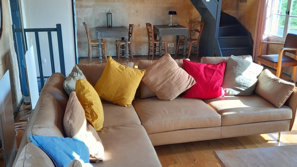 Twee woonkamers. Elk met zijn eigen specifieke sfeer en karakter. Je komt binnen in de woonkamer die nog helemaal in de sfeer van 80 jaar geleden is. Met origineel blauw balkenplafond en het originele open keukentje van vroeger - niet meer dan een klein aanrechtje met marmeren blad en een aardewerk gootsteen. Te klein om echt te koken, maar prima voor het zetten van koffie en thee. Boven de wasbak een mooi oud raam met uitzicht op de ruime tuin en het kerktorentje. In deze kamer is alles helemaal origineel gebleven.