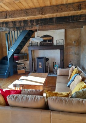 In de voorpui, over de hele breedte van de kamer: twee ramen en vier openslaande deuren, zodat er heel veel licht naar binnen komt. En andersom is het uitzicht op het weiland onbelemmerd. Je zit hier tegelijk binnen en buiten. Blikvanger is een grote, originele houten schouw, met een pelletkachel. In de hoeken draaien twee houten trappen naar boven, richting de twee afzonderlijke slaapkamers.